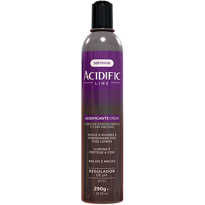 O Creme Acidificante Blond da linha Acidific Line Soft Hair foi desenvolvido especialmente para cabelos loiros, descoloridos e com mechas. Ele atua como um tratamento 2 em 1, unindo o reequilíbrio do pH à reparação da fibra capilar, garantindo mais cor, brilho e resistência para os fios sensibilizados. Sua fórmula combina Vinagre de Maçã e Ácido Cítrico, que regulam o pH e selam as cutículas, com o poder nutritivo da Manteiga de Karité, do Óleo de Gérmen de Trigo e das Ceramidas, que repõem lipídios e devolvem maciez. A Queratina fortalece, melhora a elasticidade e reconstrói os fios danificados por processos químicos. Com ação iluminadora e condicionamento intenso, o Creme Acidificante Blond ajuda a proteger a cor, reduzir a porosidade, alinhar as cutículas e recuperar a vitalidade dos fios loiros.