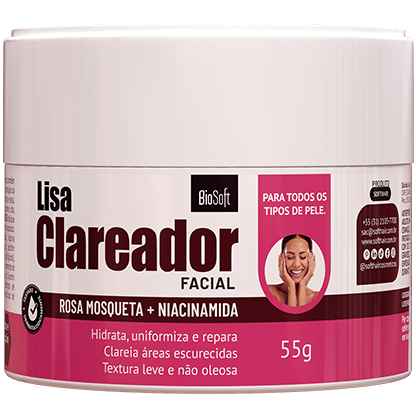 O Lisa Clareador Facial Rosa Mosqueta + Niacinamida Bio Soft foi desenvolvido para quem busca uma pele mais iluminada, viçosa e uniforme, com clareamento gradual e cuidado diário. Sua fórmula combina ativos que atuam desde a formação da melanina até a reparação da pele, ajudando a clarear áreas escurecidas, uniformizar o tom e melhorar a aparência geral do rosto. Ao mesmo tempo, promove hidratação intensa, renovação celular e toque macio, com textura leve e não oleosa. Com uso contínuo, os resultados podem ser percebidos entre 7 e 21 dias, deixando a pele com aspecto mais saudável, luminoso e equilibrado. Pode ser usado durante o dia e à noite e é indicado para todos os tipos de pele.