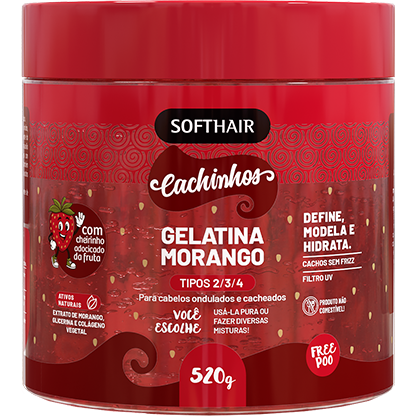 A Gelatina Morango Cachinhos Soft Hair foi desenvolvida para proporcionar definição com fixação média aos cabelos ondulados e cacheados, respeitando todas as curvaturas. Ela define sem pesar, controla o frizz e mantém os fios com movimento natural, volume equilibrado e toque macio. Com cheirinho adocicado de morango, a fórmula conta com Glicerina e Colágeno Vegetal, que ajudam a manter a hidratação, aumentam a suavidade dos fios e melhoram a curvatura dos cachos. O resultado são cachinhos definidos, leves e com textura suave, sem aspecto ressecado. A gelatina não resseca os fios e é livre de petrolatos e silicones, sendo ideal para o uso diário ou para criar misturinhas personalizadas.