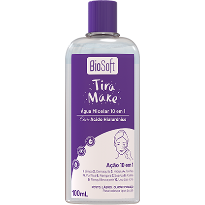 O Tira Make Bio Soft é uma água micelar suave e multifuncional, ideal para remover maquiagens leves e resíduos de protetor solar no dia a dia. Formulada com Ácido Hialurônico, hidrata e ajuda a manter a elasticidade e o equilíbrio natural da pele, enquanto as micelas capturam impurezas de forma eficaz, sem agredir. Com ação 10 em 1, limpa, demaquila, hidrata, tonifica, purifica, revigora, suaviza, acalma, reequilibra a pele e pode ser usado de dia e à noite. O resultado é uma pele macia, fresca e com toque suave, pronta para receber outros cuidados.